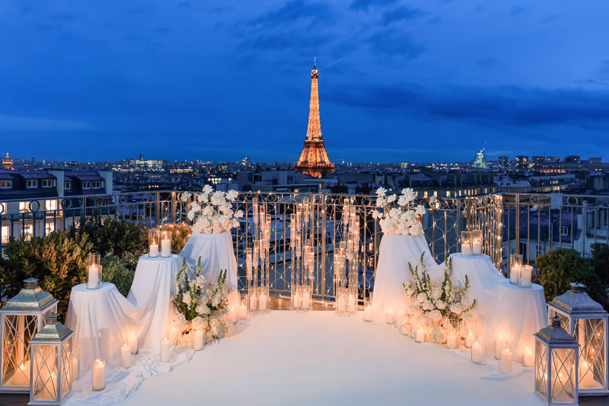 Direct Eiffel Tower views from a private rooftop. Flowers, photography, music, and full-setup ready before you arrive. From €2,100.